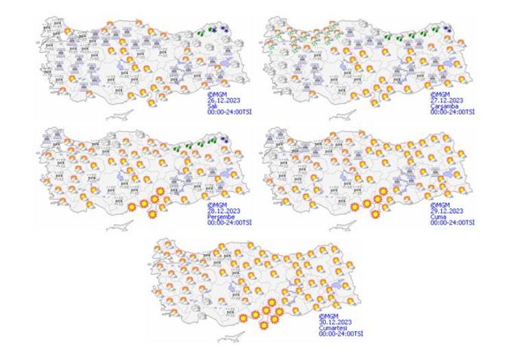 Meteoroloji Genel Müdürlüğü tarafından yapılan son değerlendirmelere göre: Ülkenin kuzey ve doğu kesimlerinin parçalı ve çok bulutlu, Doğu Karadeniz kıyılarının(Giresun hariç) yağmur ve sağanak, Doğu Karadeniz’in iç kesimleri ile Ardahan çevrelerinin karla karışık yağmur ve kar yağışlı, diğer yerlerin az bulutlu ve açık geçeceği tahmin ediliyor. Yağışların; Artvin çevrelerinde kuvvetli olması bekleniyor.