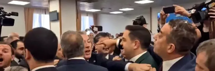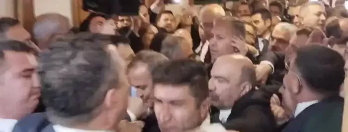 Kapı önündeki arbede sırasında, Bakan Ali Yerlikaya güvenlik ekiplerinin müdahalesiyle salona giriş yaptı.